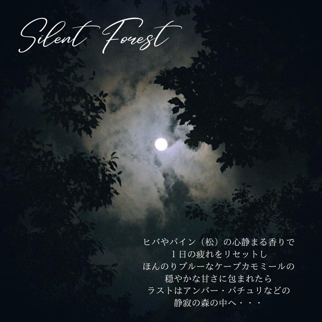 静寂と癒しをテーマにした「Silent Forest」は、あなたにリラックスをもたらす特別なナイトフレグランスです。この香りは、森林の奥深さを感じさせるウッディなノートと、心を落ち着けるアーシーな香りが融合し、安らぎの空間を演出します。